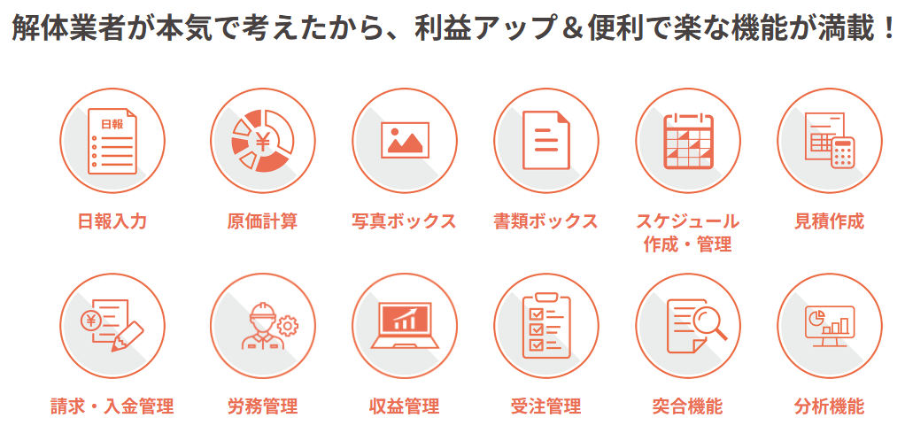 「解体くん」は、見積作成から工事スケジュール、台帳・原価管理、請求、入金確認、統計分析までを一元化し、現場と事務の手間を大幅に削減する業務管理システムです。コスト把握や進捗管理をリアルタイムで行え、生産性向上に貢献します。 詳しくはこちら