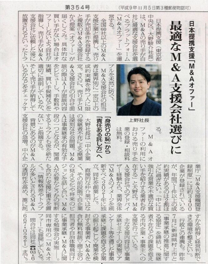 記事内では、弊社が運営するM&A支援会社マッチングプラットフォーム「M&Aオファー」の仕組みや、地域企業の存続に向けた自治体連携(新潟県村上市など)の活動について詳しく取り上げられています。